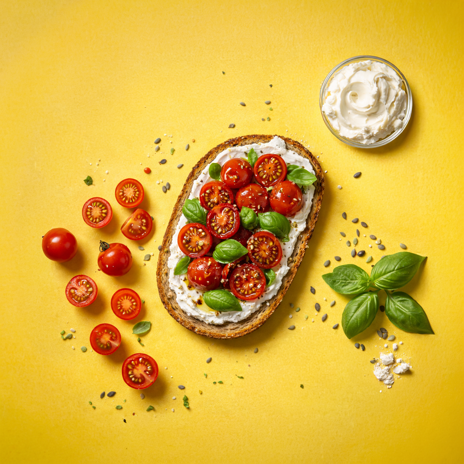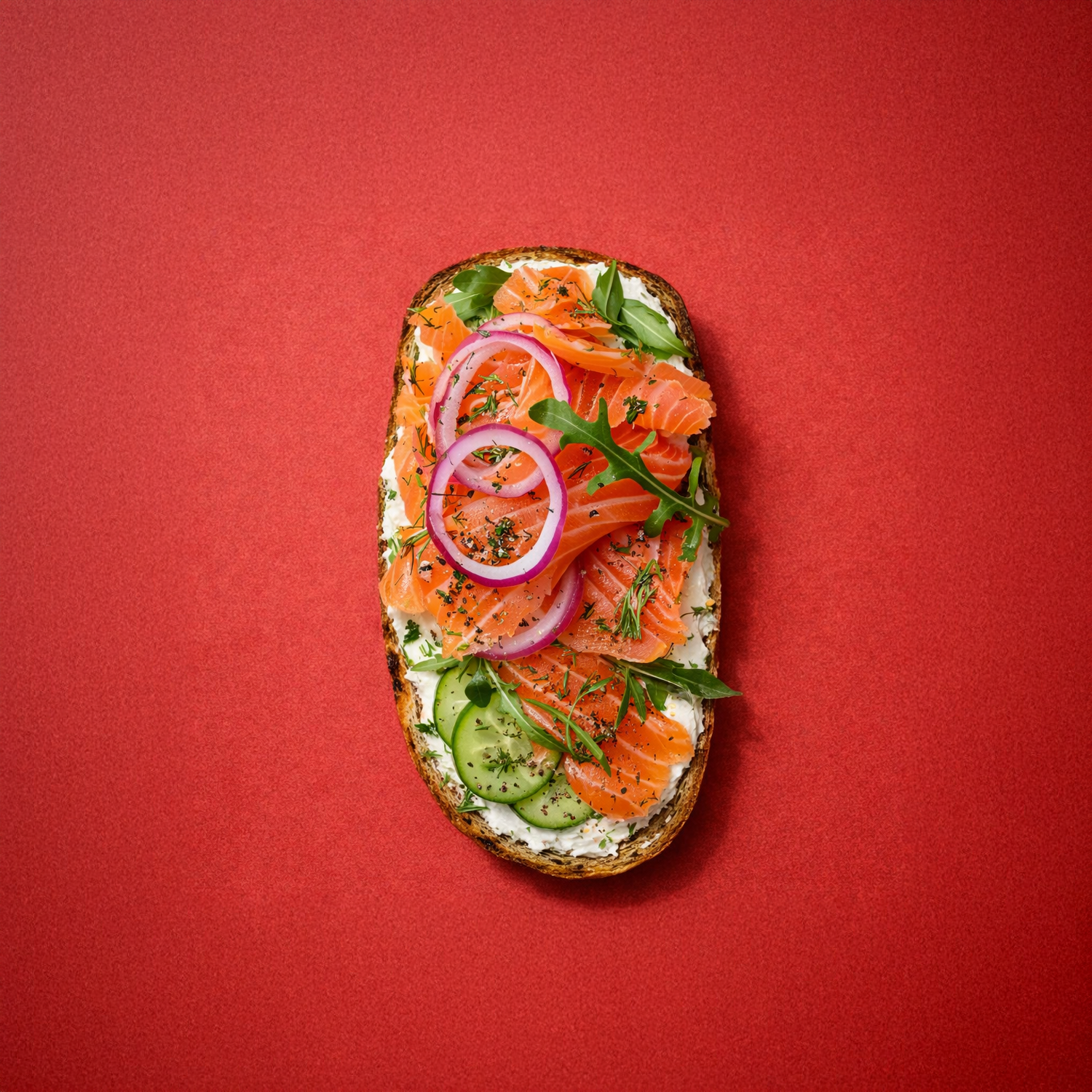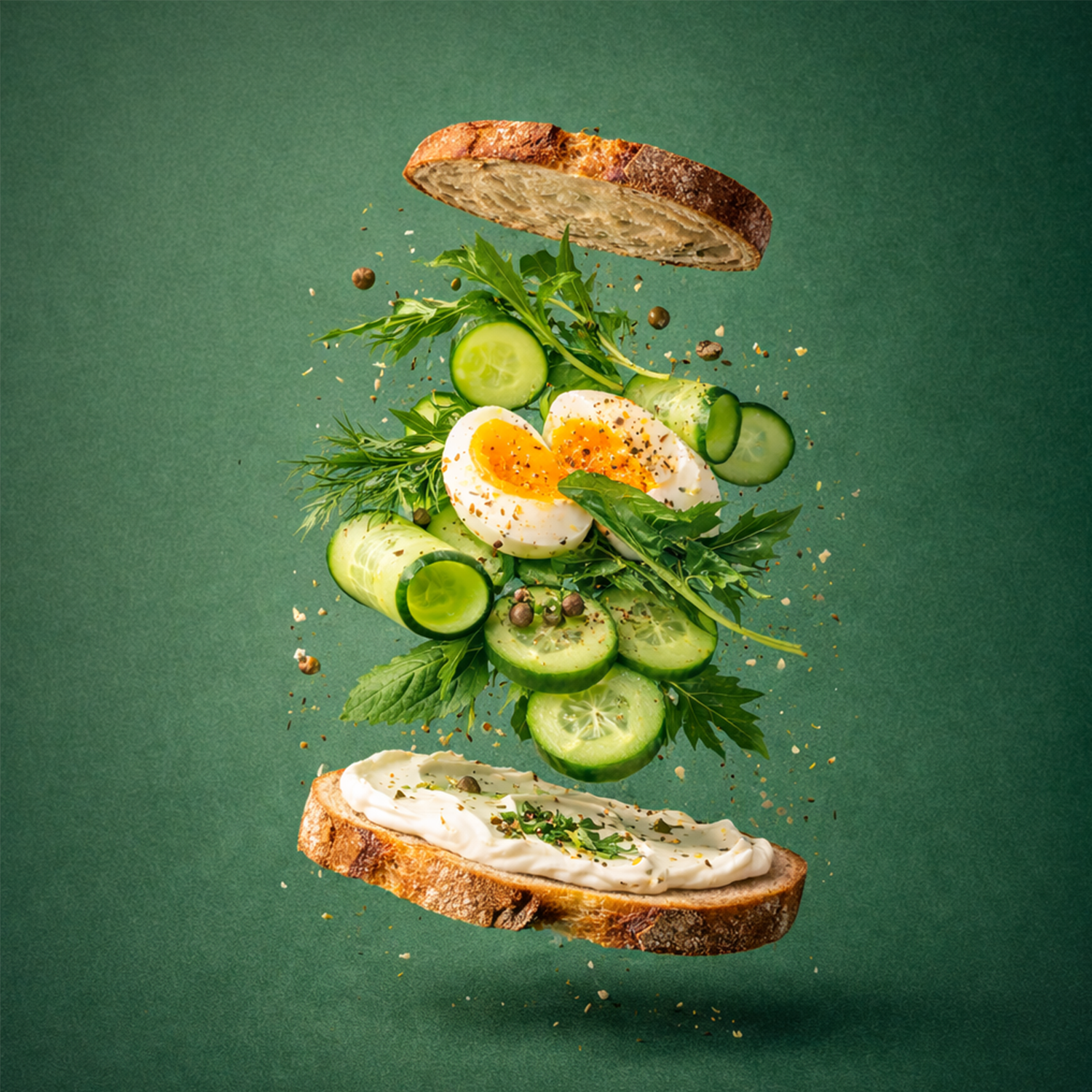 Ingredients are shown suspended in mid-air, layered between slices of bread. This visual approach breaks away from traditional food presentation, drawing attention through motion and depth. The brand’s primary color background anchors the composition while allowing textures and colors to stand out.