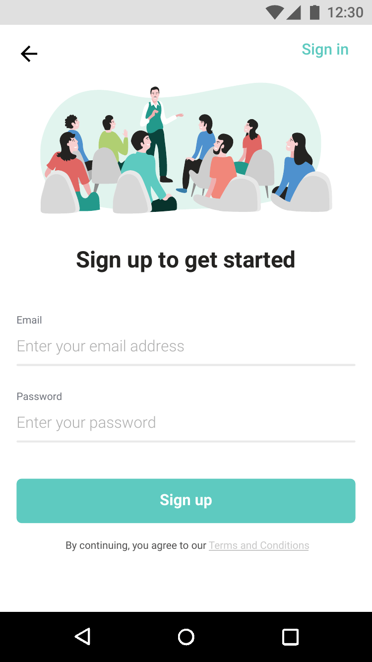 From a functional perspective, the UI design focuses on essential flows such as sign-up, login, and password recovery, keeping interactions intuitive and minimal. Clear call-to-action buttons, generous spacing, and consistent layouts ensure usability across devices. As a whole, the project demonstrates how illustration-led UI design can strengthen brand personality while enhancing user experience in an Android-based educational platform.