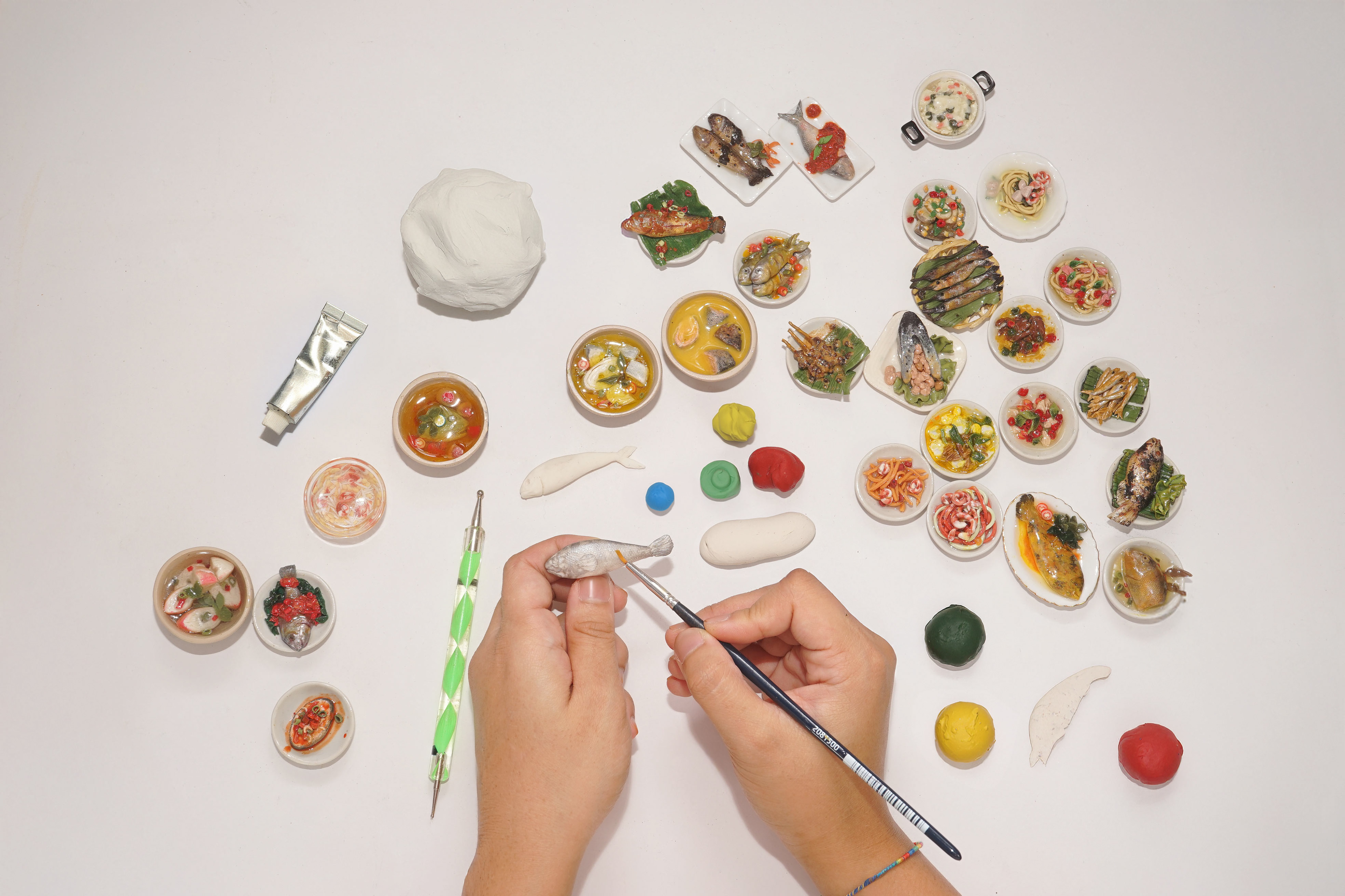 Once the base colors were prepared, the sculpting phase focused on building form and texture. Ingredients were shaped by hand and refined using everyday tools such as aluminum foil, toothbrushes, blades, and dental floss to mimic natural irregularities. Bread surfaces were pressed and scored to suggest crust and crumb, while vegetables were layered and indented to give depth. This hands-on approach allowed for subtle imperfections that enhance realism and visual warmth.