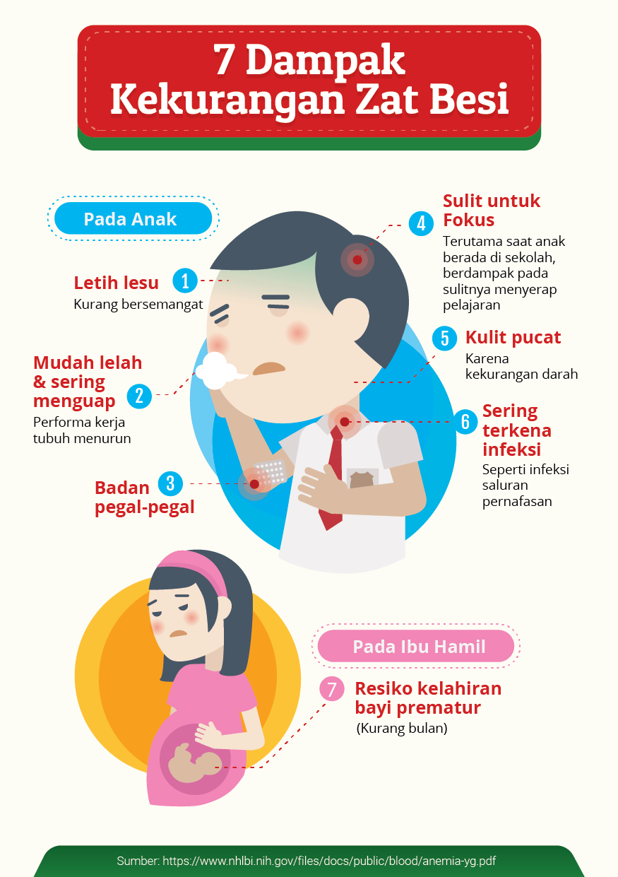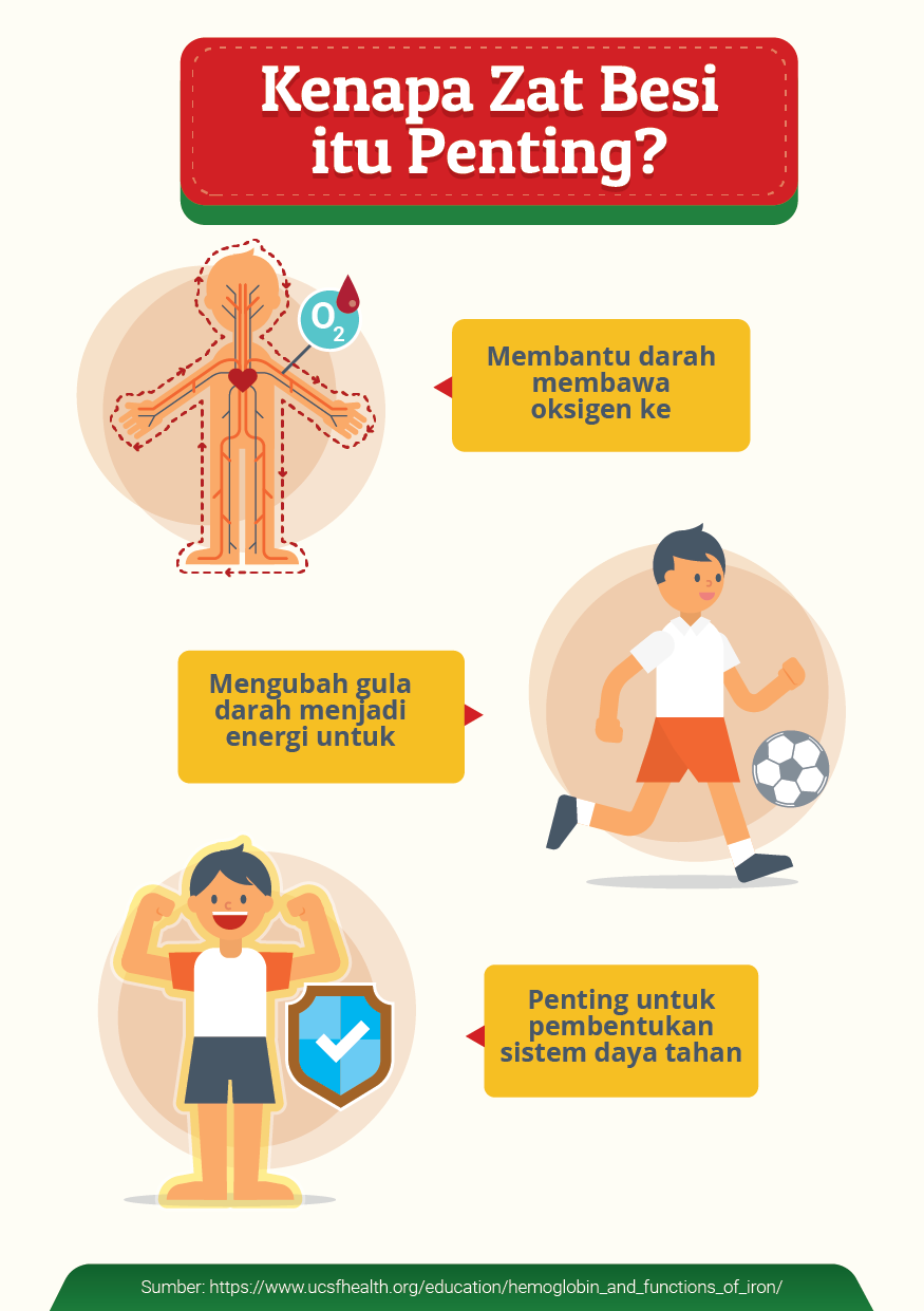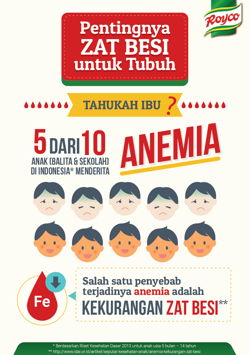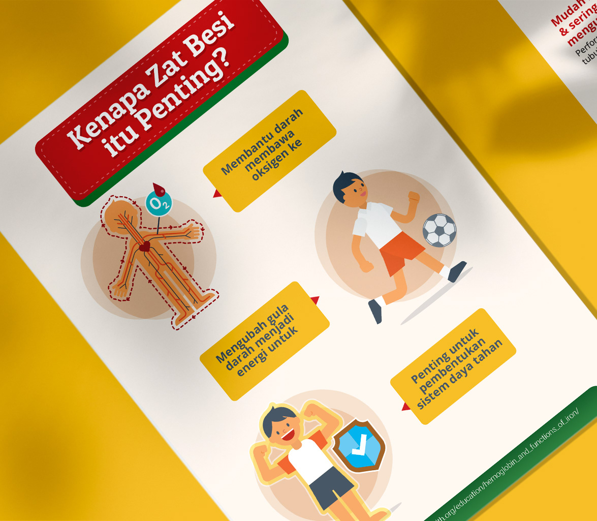The content highlights key facts about iron deficiency, including its prevalence among children in Indonesia and its effects on physical energy, concentration, immunity, and overall development. By combining data, simple icons, and relatable characters, the visuals turn abstract health concepts into concrete, memorable messages that can be quickly absorbed.