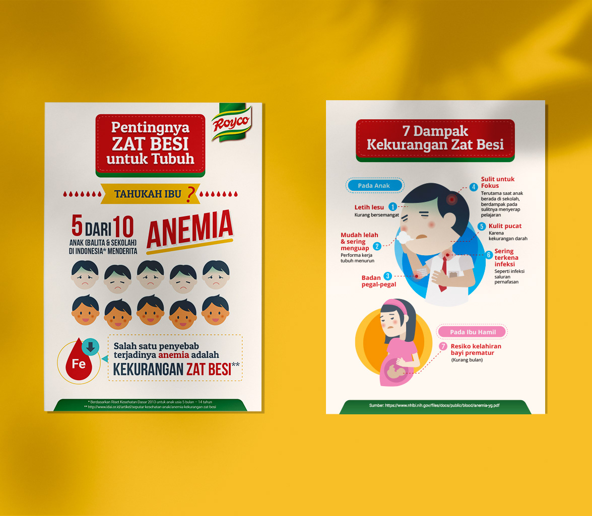 This project is a series of educational infographics designed to communicate the importance of iron intake and the impact of anemia in a clear, approachable way. Developed as a health-focused visual campaign, it translates medical information into friendly illustrations and structured layouts that are easy to understand for a broad audience, especially parents and caregivers.